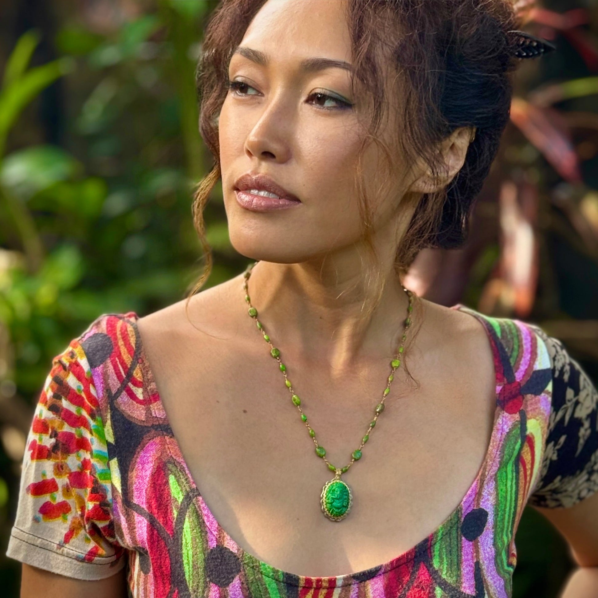 Adorn yourself with this exquisite, one-of-a-kind "Moon Lotus" pendant featuring 20.1 carats of hand-carved rare green turquoise from Arizona. This skillfully-rendered depiction of Ganesha, the Hindu god of good fortune, is set in an oxidized sterling silver "lotus" frame. Encircled by a matte yellow 22k gold bezel with hinged clasp, this 1.5” x .75” pendant will surely become a treasured talisman. Pair it with our matching green turquoise necklace (as seen on the model) or your own bead necklace or gold or silver chain. Unique and irreplaceable – secure this bespoke gem today! Note: This piece cannot be reproduced due to the scarcity of Arizona green turquoise.