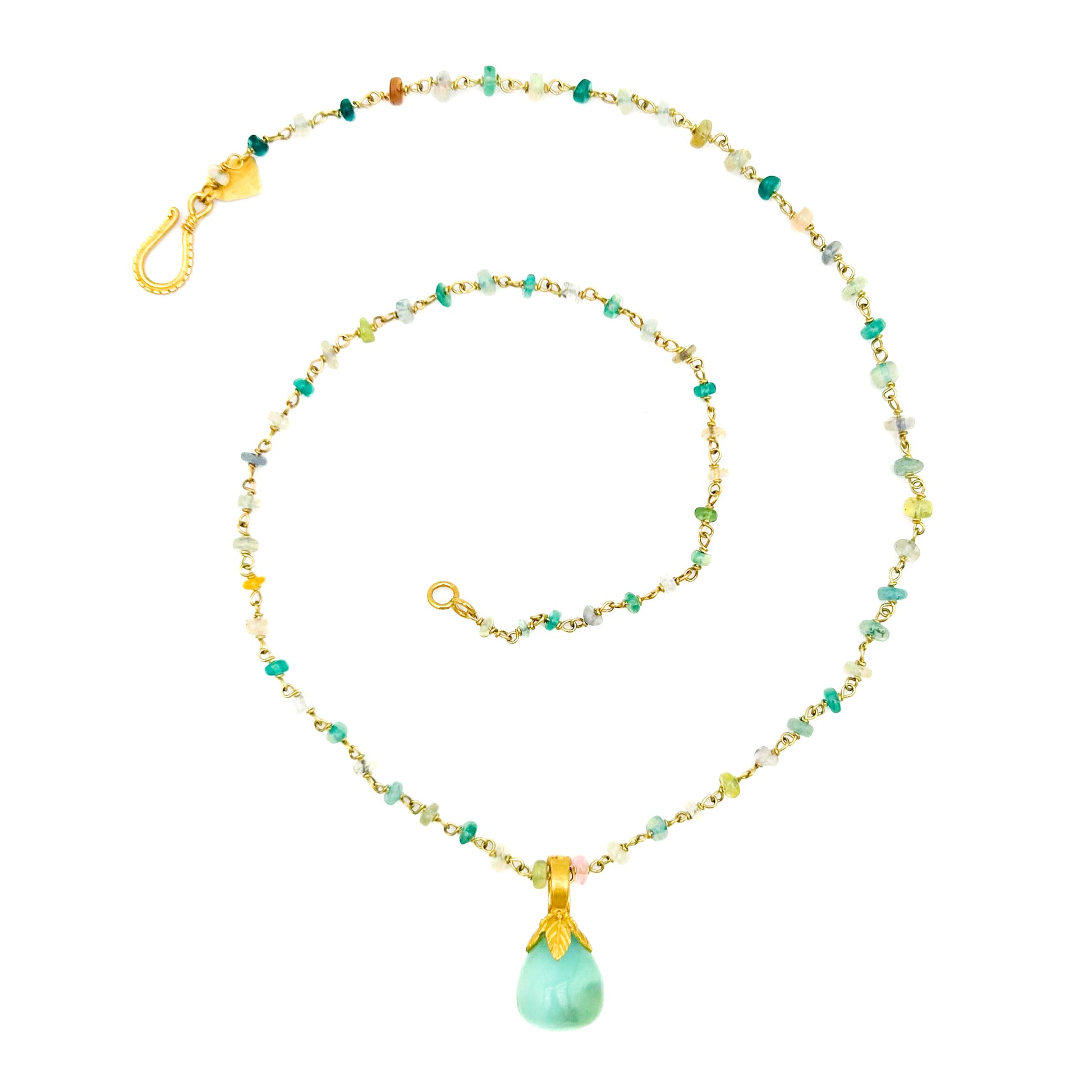 Like a wearable drop of Caribbean water, this luscious aqua-blue 7.05 carat Peruvian opal "Sri Lanka" pendant is a delicate complement to our fine beaded necklaces and chains (shown on models). With a finial cap of four 22k yellow handmade gold leaves, the drop-shaped gem resembles a magical fruit hanging from the 18k hinged bail. Overall size is .5" x .75”-- this is a rare stone and cannot be reproduced, so if you fancy this one, order now!