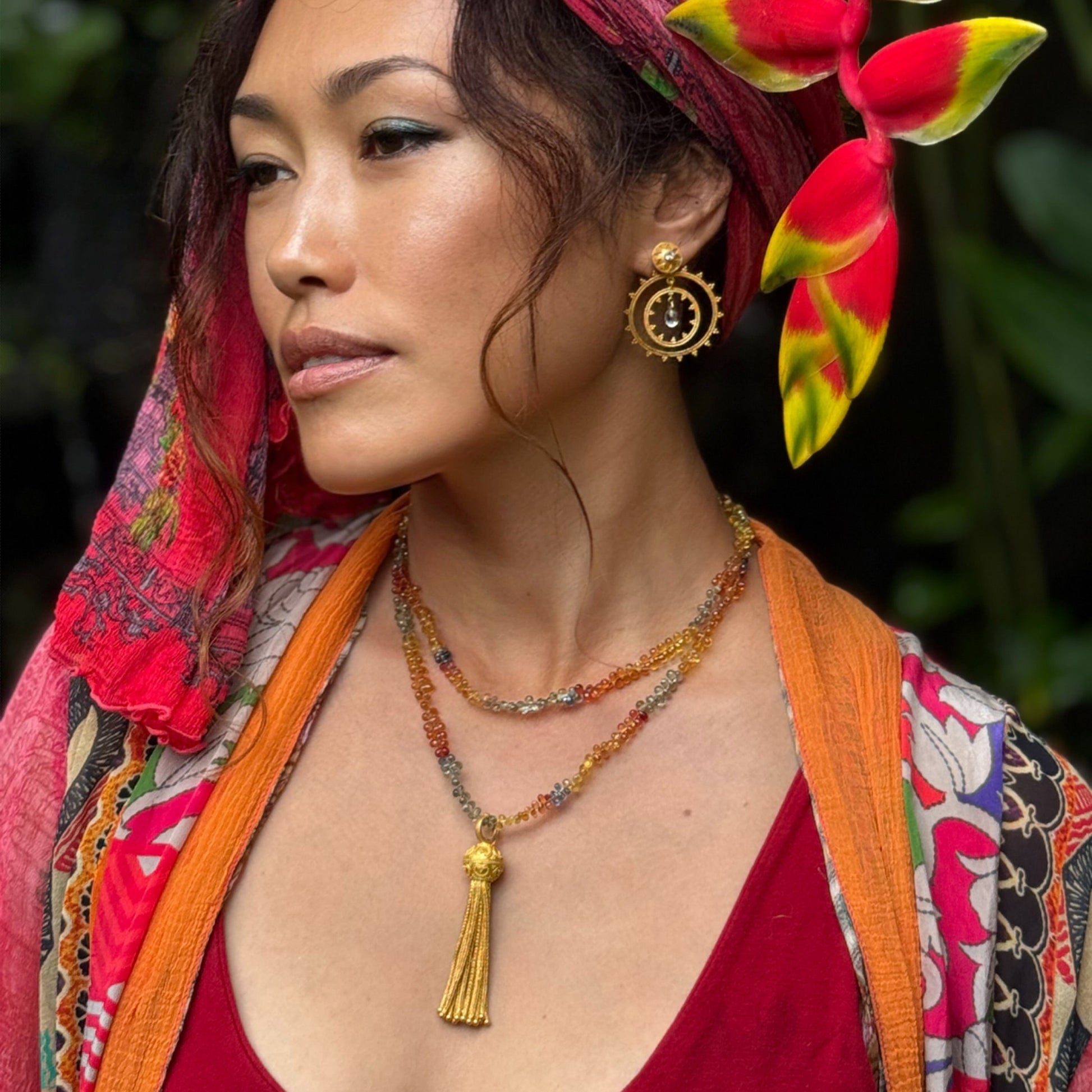 Our "Westminster Tassel" pendant is meticulously hand-fabricated in 22k yellow gold, featuring 1mm silky hand-woven bead-tipped chains topped with a matte-finish 22k gold granulated finial cap decorated with fine granulation and filigree wirework. Detachable 18k hinged bail with secure locking mechanism allows for accommodation of chains up to 4mm in diameter. Looks great on longer, opera-length chains, beads, or pearls, and layered with pearl strands and other beaded necklaces, or doubled (shown on models). Try it with our "Long Lola" or "Wheat Chain" styles.