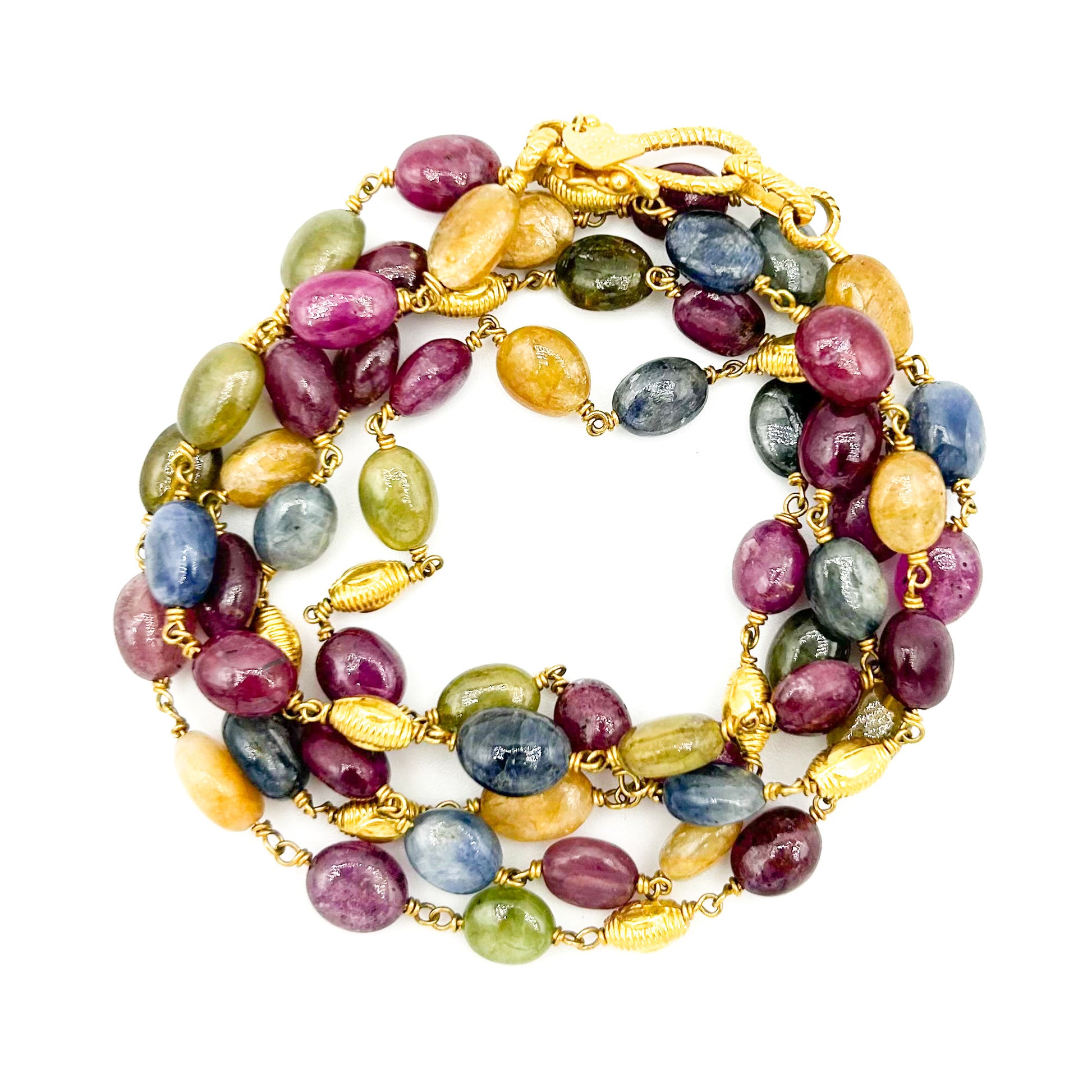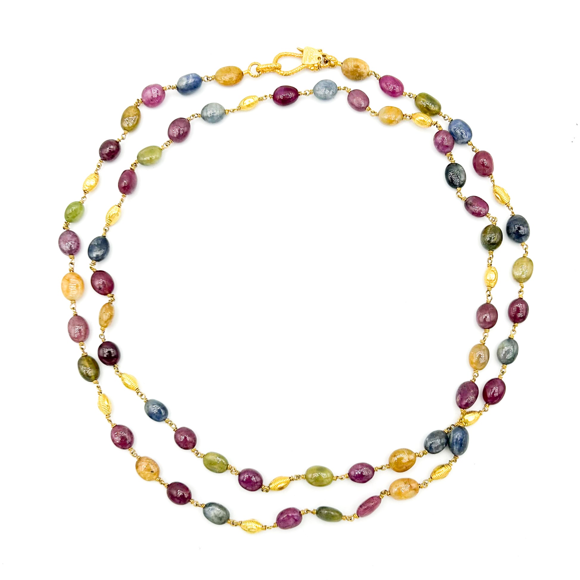 Revel in the vibrant allure of the "Winona Bangkok" necklace, a 38” statement piece that radiates Boho chic. This handmade open-length beaded chain boasts 200 carats of oval cabochon sapphires and rubies, with rich hues of blue, red, yellow, green and peach. Fabricated with 18k gold wire links and secured by a matching hook clasp, this necklace can accommodate many of our pendants (shown with gold tassel); it drapes effortlessly, adding a bold yet elegant touch for layering or solo-wear. Converts to a double strand, belt, or wrap bracelet (shown on model), making it a fabulously useful travel piece for globetrotters!